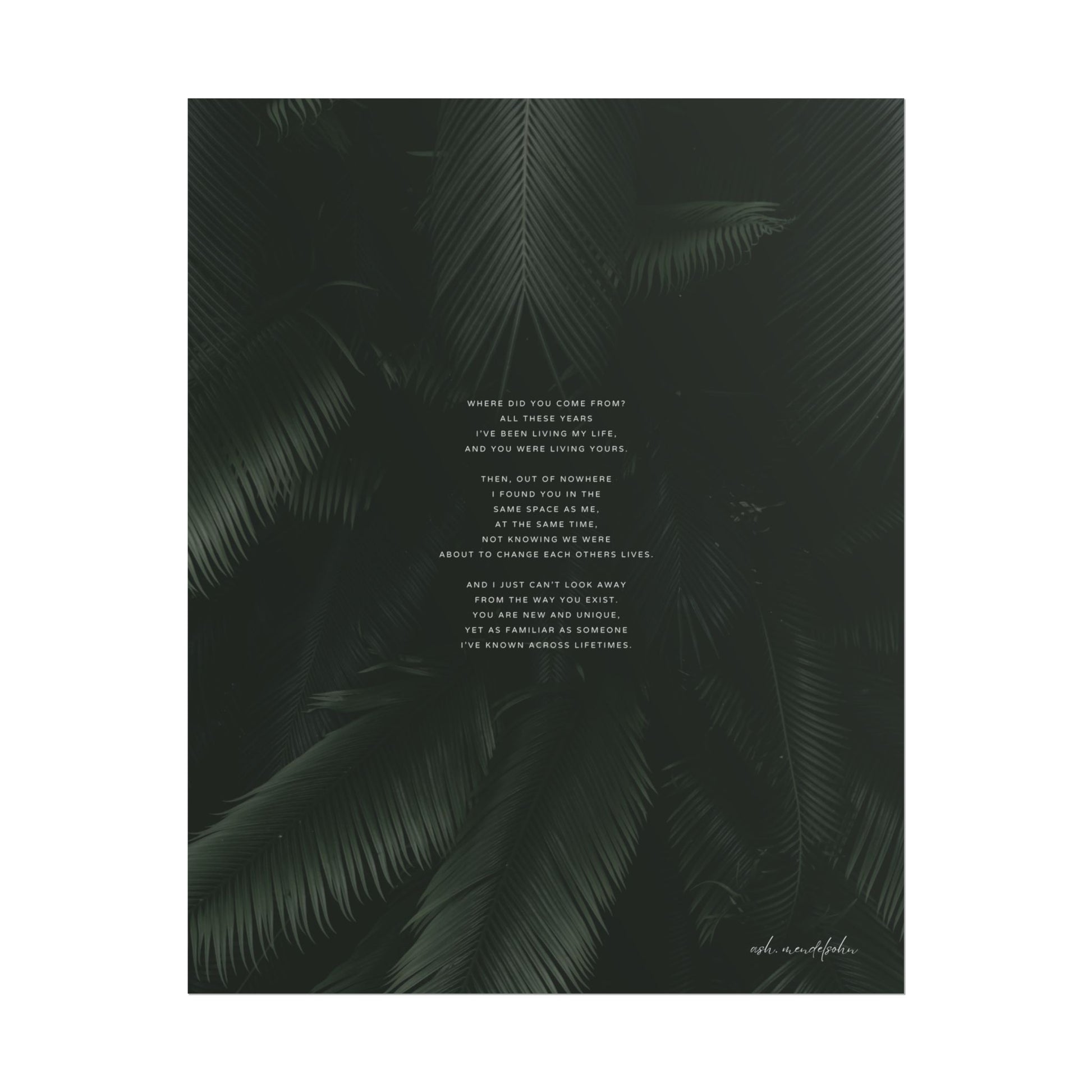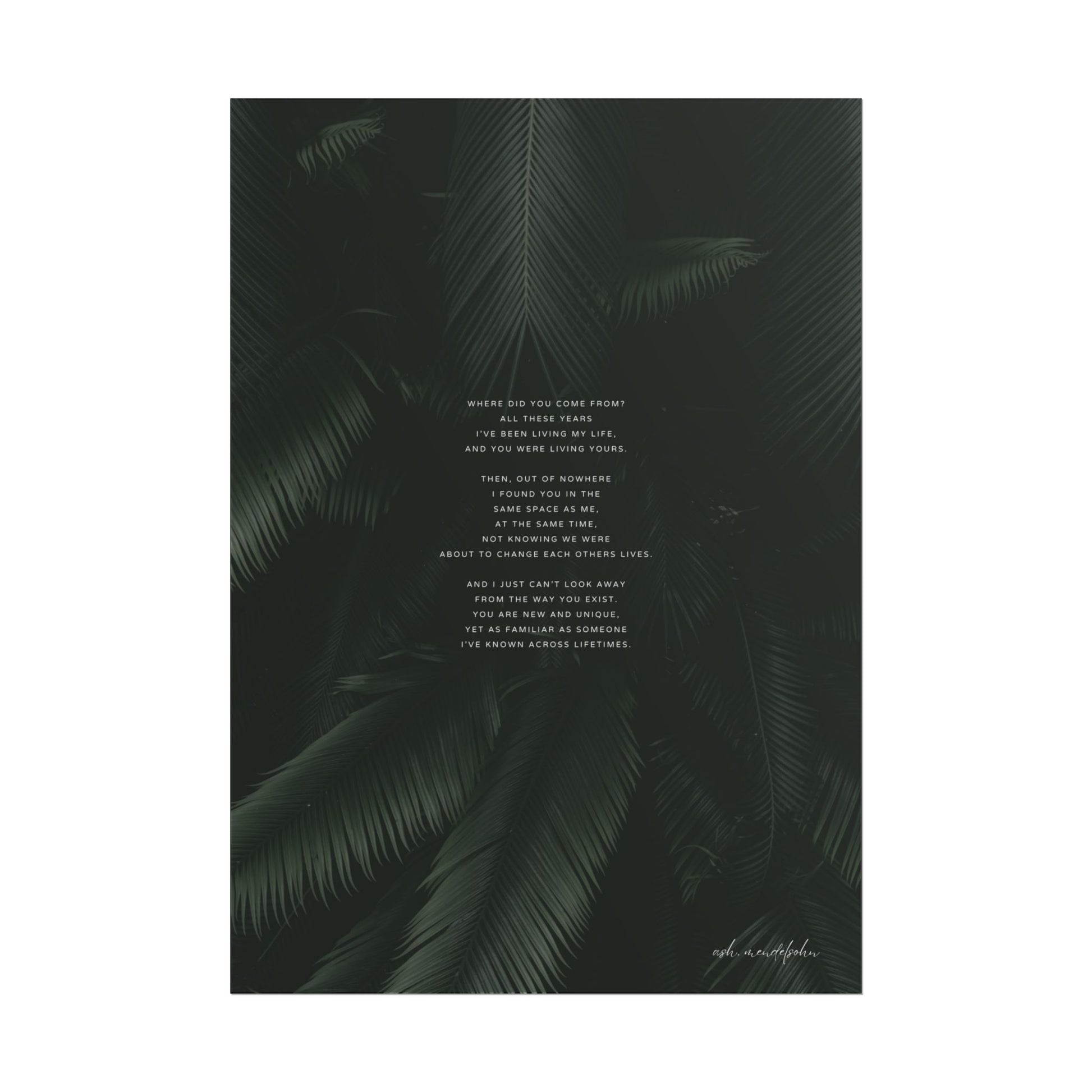 Bring a touch of love, longing, and synchronicity into your space with this matte rolled poetry print, featuring one of my most beloved pieces. Designed with a deep, moody forest aesthetic, it captures the feeling of finding someone you’ve known across lifetimes—new, magnetic, and somehow inevitable.