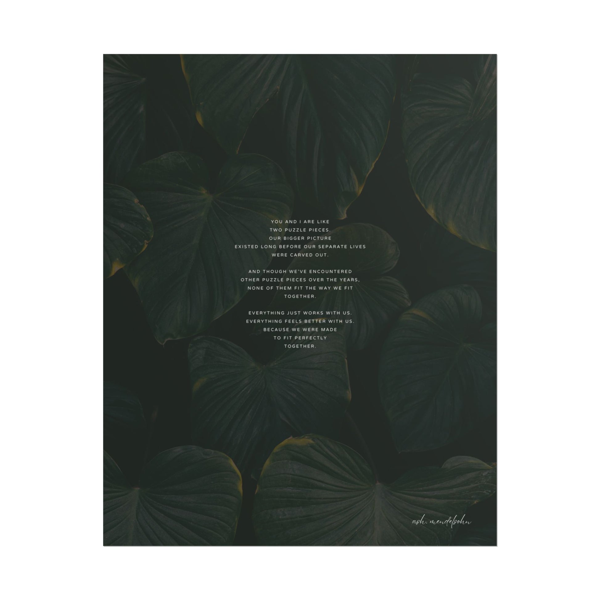 Some love stories don’t begin. They simply continue. This matte rolled poetry print is for the kind of connection that just fits—where everything feels softer, easier, and undeniably meant to be. The moody forest backdrop mirrors the quiet certainty of knowing you’ve found your perfect match in a chaotic world.