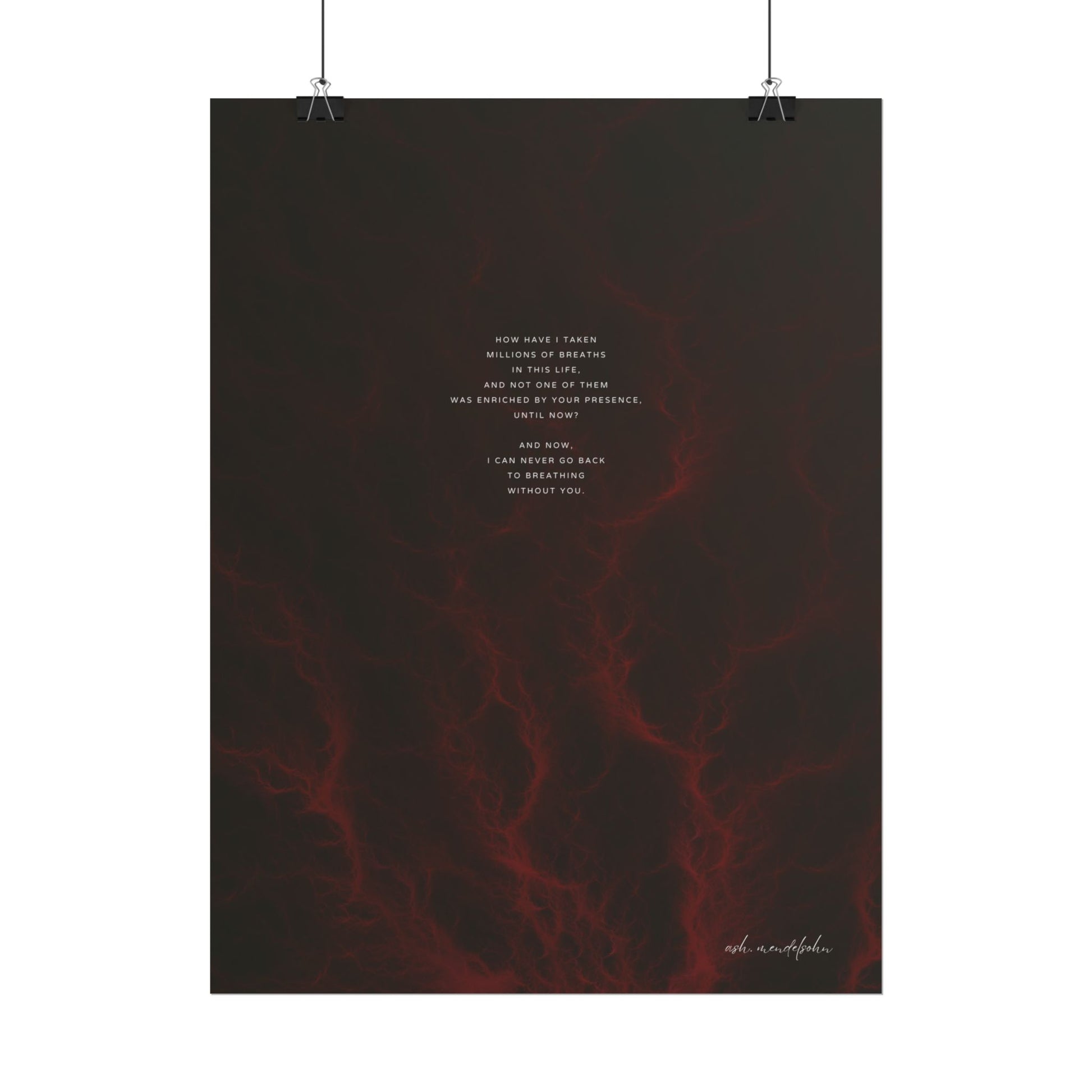 There’s a moment in love where even your breath changes. This matte rolled poetry print from the Romance Series captures that shift—the quiet awe of wondering how you ever lived before them. With a dark romantic design and deep red tones, this piece speaks to the kind of love that alters your very existence in the most tender, irreversible way.