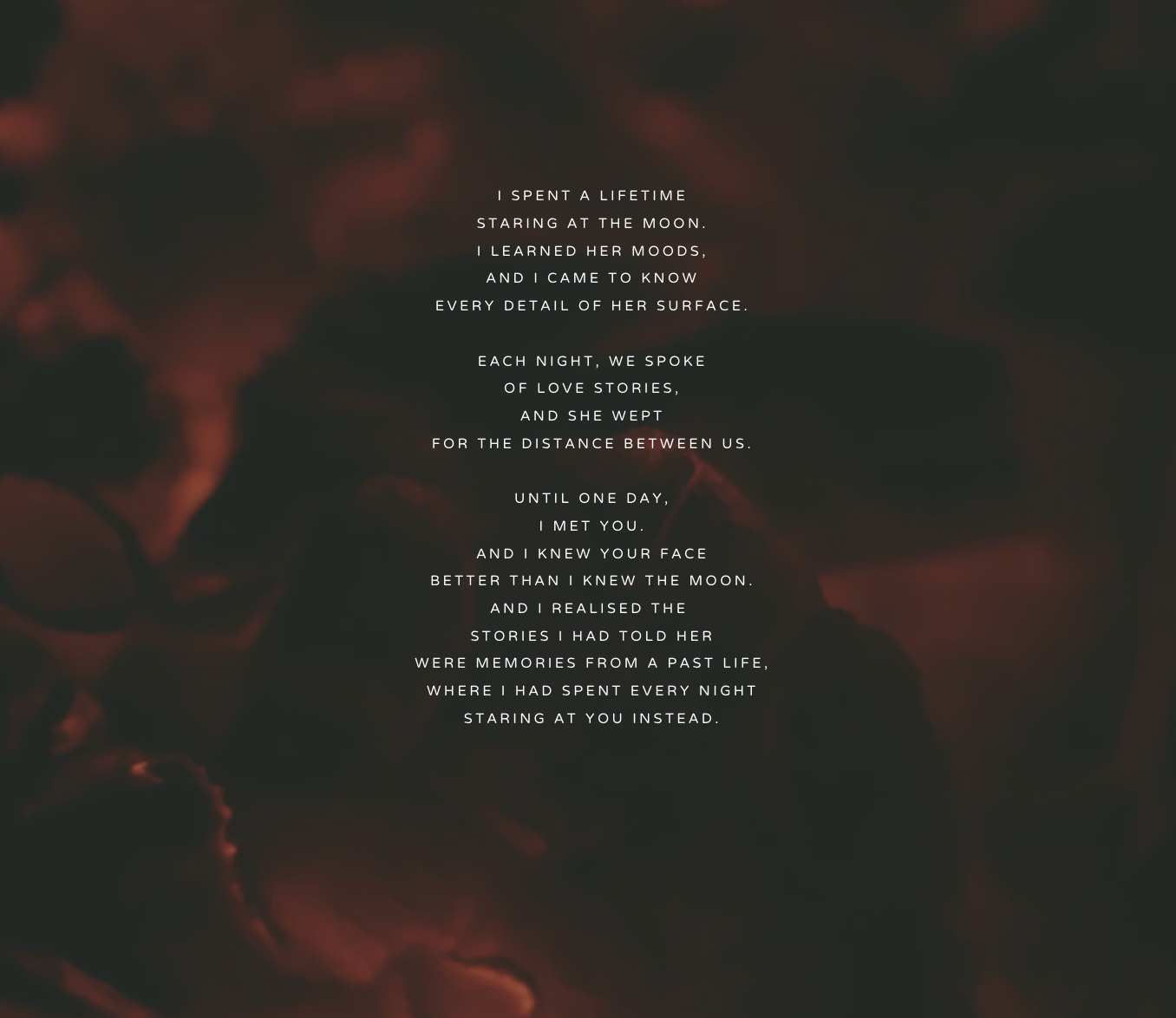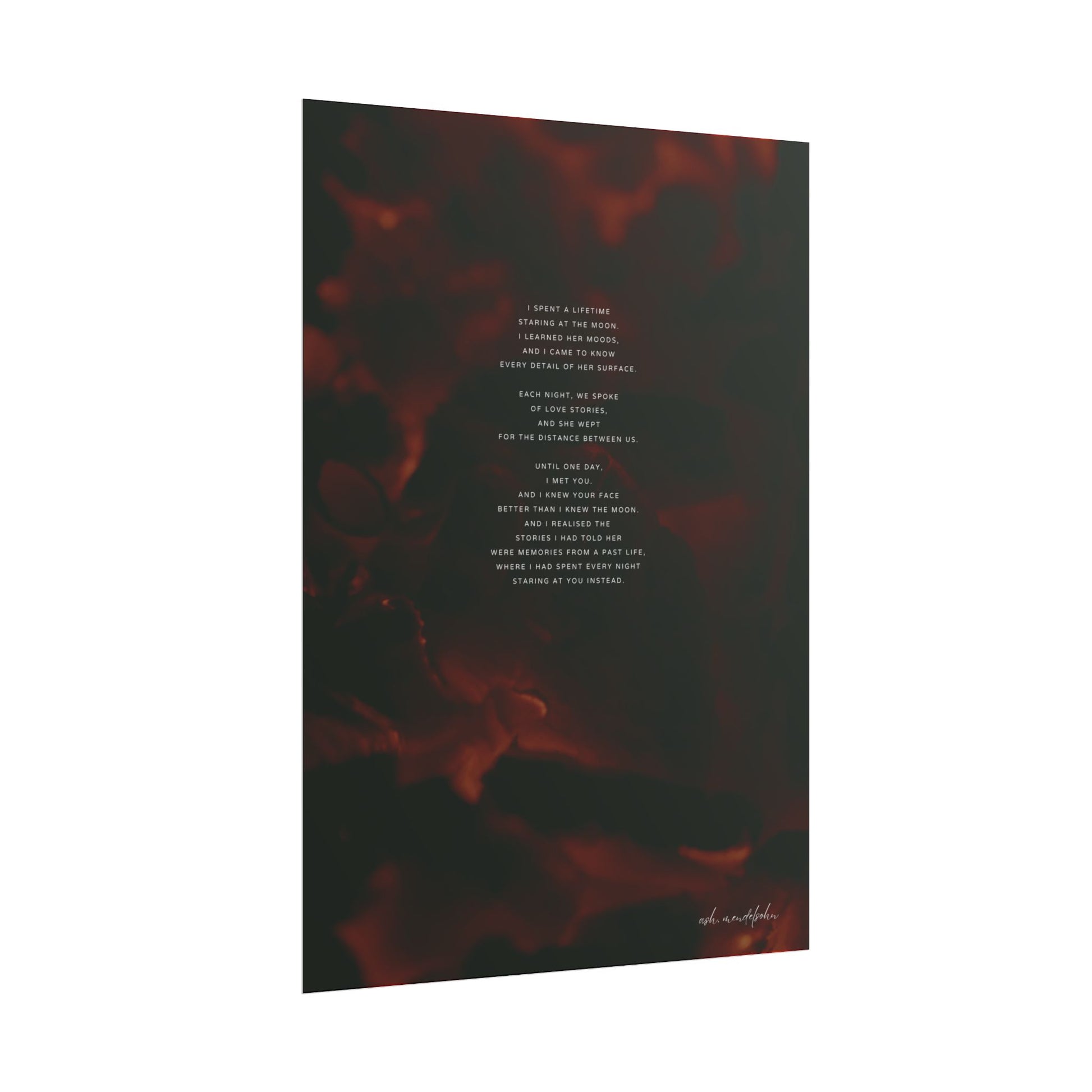 There’s a certain kind of love that feels like remembering. This matte rolled poetry print from the Romance Series tells the story of that eternal recognition—the kind of love you’ve whispered to the moon about long before you met. With deep reds and a dark, dreamy aesthetic, it captures the feeling of rediscovering a soul you’ve always known.