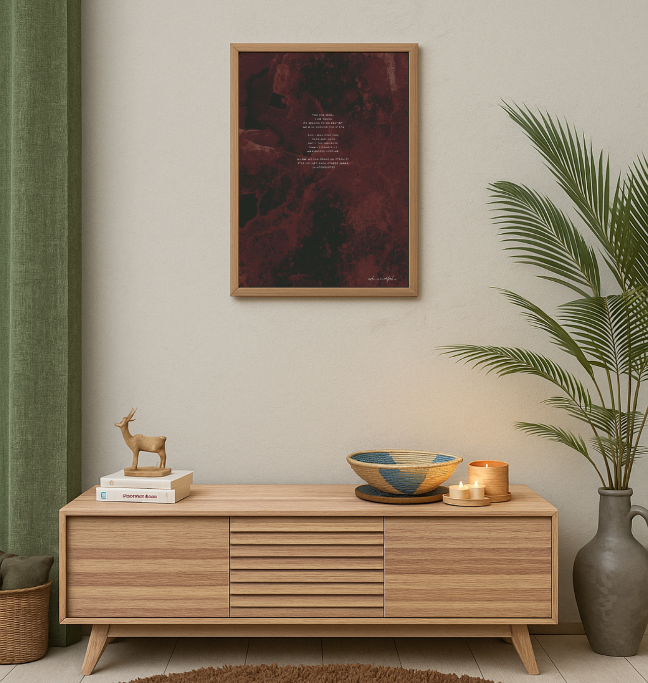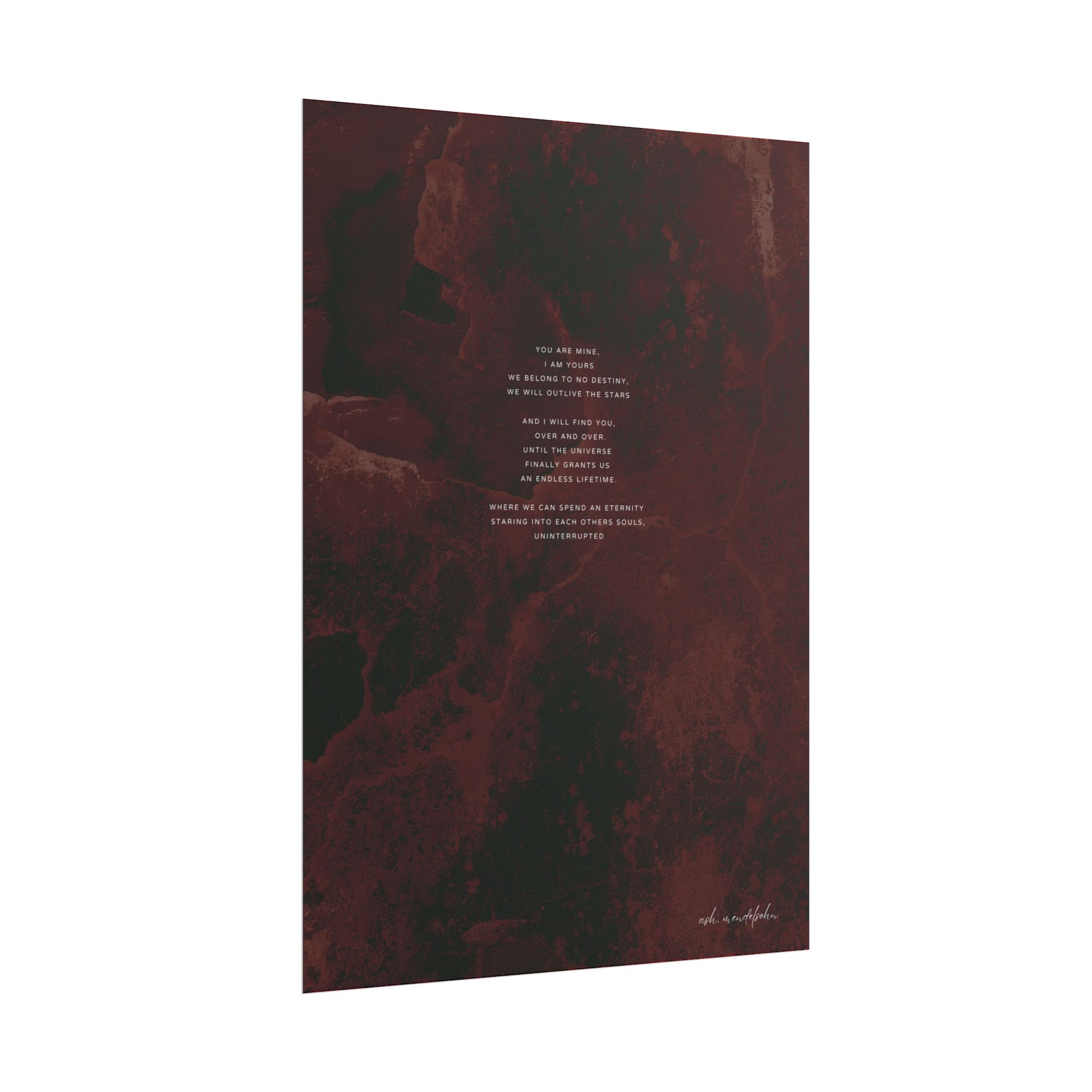 Some loves aren’t bound by time or fate. They transcend it. This matte rolled poetry print from the Romance Series is a vow across lifetimes—a promise that no matter the place, the century, or the stars themselves, your souls will always find each other. With deep crimson detailing and a dark, romantic backdrop, this piece carries the weight of soul recognition and the ache for forever.
