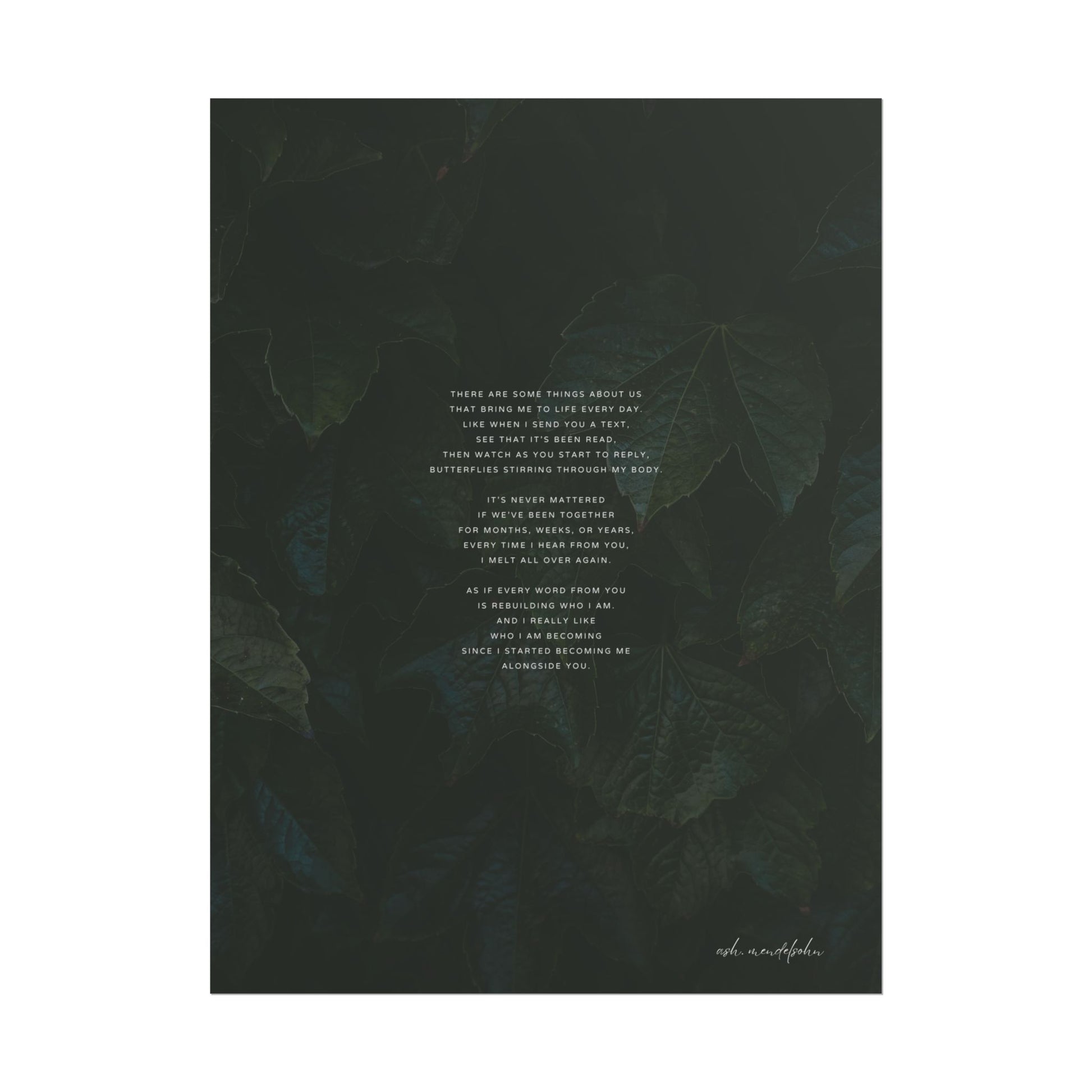 Love isn’t always loud. Sometimes it’s the softness of a text reply that still sends butterflies through your body. This matte rolled poetry print captures the intimacy of being seen, chosen, and changed in the smallest, most meaningful ways. Set against a moody forest backdrop, it evokes the feeling of growing into yourself alongside someone who loves you in all your seasons.
